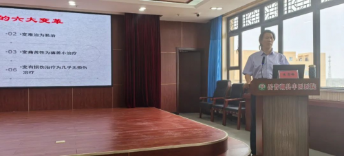 挂牌仪式后,针刀医学第二代掌门人朱秀峰院长亲自开展针刀技术公益培训讲座。他详细阐述了针刀医学自开创以来的辉煌发展历程,从朱汉章教授开创针刀疗法,到如今针刀医学在全球的广泛应用,每一步都凝聚着无数针刀人的智慧与汗水。在讲座中,朱院长将深奥的医学原理转化为通俗易懂的比喻,把人体经络气血运行比作城市交通系统,生动讲解针刀如何像交警疏导交通一样,精准治疗人体软组织病变,让学员们轻松理解针刀医学的奥秘。他结合大量临床实例,剖析疼痛性疾病、软组织损伤等病症的针刀治疗方案,并分享操作技巧与注意事项,强调因人而异的治疗理念。学员们全神贯注,认真记录,纷纷表示收获颇丰,对未来运用针刀技术服务患者充满信心。