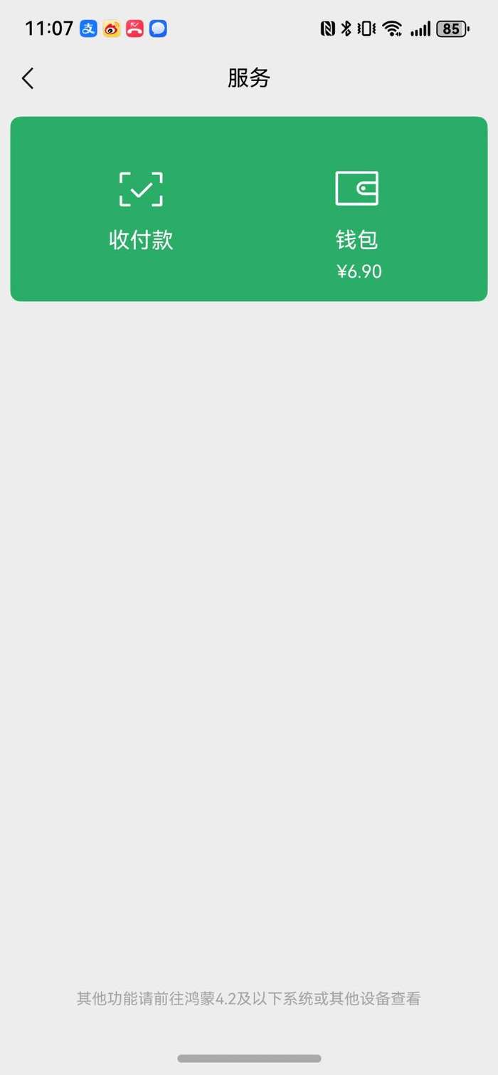 鸿蒙版微信同样支持刷朋友圈、多终端登录,以及二维码收/付款等功能,但还未增加视频号入口。